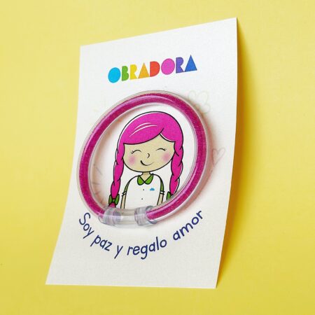 Pulsera en polímero de PVC reciclado y perlado fucsia traslúcido + tarjeta Soy paz y regalo amor.